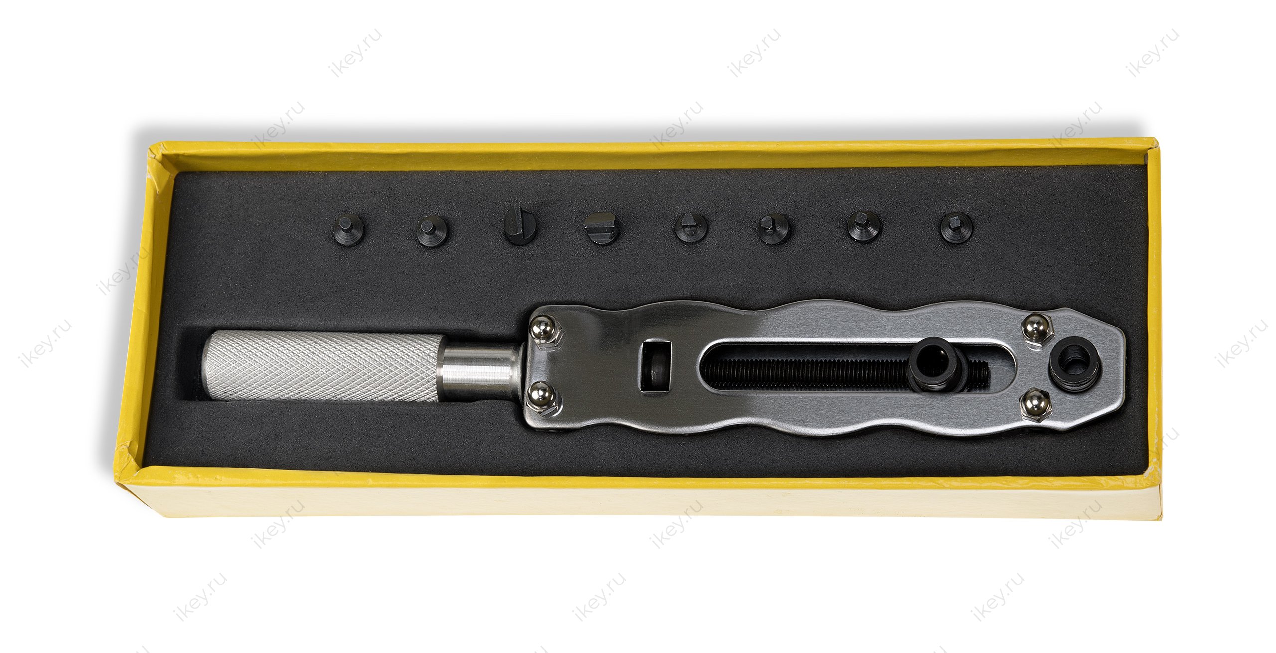 Инструмент для открытия винтовых крышек 2-х точечный. Ширину можно регулировать с помощью вращения ручки. В комплекте сменные насадки. Открывает крышки разных диаметров.